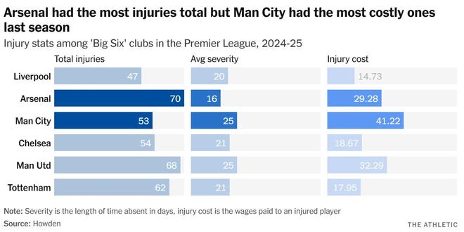 与此同时,单看上个赛季,他们的对手曼城在这项指标上损失最为惨重——尽管切尔西、阿森纳、曼联和托特纳姆热刺的伤病总数都更多。曼城遭遇了罗德里等关键球员的出勤问题,因此受到的打击更大。阿森纳主帅米克尔-阿尔特塔则不得不应对更多短期伤病,其中包括许多边缘球员